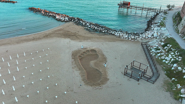 Fin dalle prime ore dell'alba, sulla spiaggia libera di Termoli (Campobasso), è comparsa un'enorme impronta umana impressa sulla sabbia, lunga 23 metri. Uno scherzo, un'installazione artistica o una trovata pubblicitaria? Sono molte le domande che si stanno ponendo in queste ore i cittadini del Comune molisano, stupiti di fronte a qualcosa di così inspiegabile.
