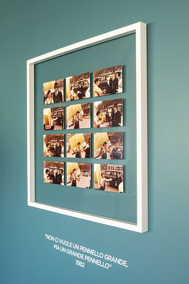 È possibile perdersi nelle foto e nei documenti storici, come la scheda tecnica del pennello Katy dedicato dal Commendatore alla figlia Catiuscia o una cambiale da lui firmata, riacquistata su eBay, o ancora il registro infortuni e i premi e i volti di una storia italiana così straordinaria da avere meritato la denominazione di marchio storico d’interesse nazionale. Filo rosso di ogni passaggio, sono le opere di DutyGorn, tra cui spicca Pennelli nel tempo, a volere marcare un'evoluzione che parte dalla storia con una cronologia visiva intervallata da linee che, come lancette di un orologio, scandiscono il tempo in un continuum tra passato, presente e futuro.