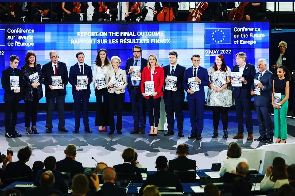 Durante la cerimonia di chiusura della Conferenza sul futuro dell'Europa a Strasburgo, la presidente del Parlamento europeo Roberta Metsola, il presidente Emmanuel Macron a nome della presidenza del Consiglio, e la presidente della Commissione europea Ursula von der Leyen hanno ricevuto la relazione sui risultati finali della Conferenza dai Copresidenti del comitato esecutivo.