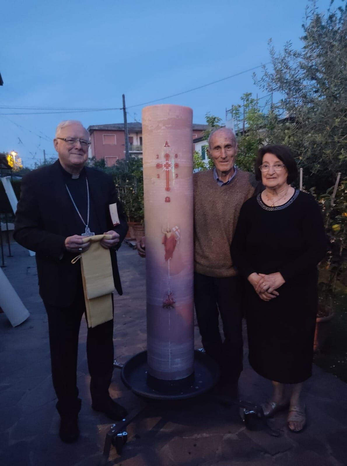 Alla vigilia del viaggio, il vescovo di Pescia mons. Roberto Filippini si era recato personalmente presso l'abitazione dei due pellegrini per benedire l'Ape e il maxicero.