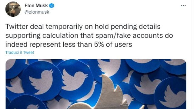 L'accordo per l'acquisto di Twitter è "temporaneamente sospeso", lo scrive in un tweet Elon Musk. Il motivo è legato alla ricezione di "dettagli che supportino il calcolo che gli account di spam/fake rappresentino meno del 5% degli utenti". Le azioni di Twitter, riporta Bloomberg sono crollate dell'11% nel pre-market dopo il tweet di Musk e le azioni di Tesla sono salite del 4,9%.