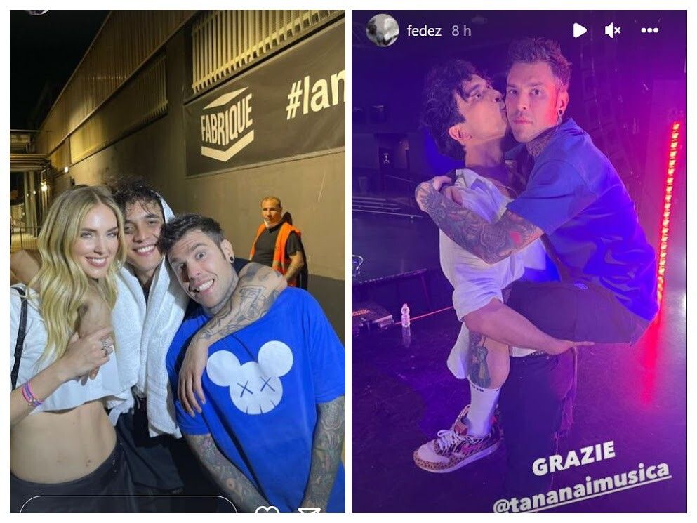“Sono riuscito a non spoilerare che ero al concerto di Tananai” scrive Fedez pubblicando uno scatto in braccio al collega. Insieme alla Ferry posa con Tananai con sorrisi ed emozioni incontenibili. “Come la curva del Napoli” commenta il rapper spiegando il pubblico festante per l’inedito duo sul palco. E poi ancora “Grazie patato” scrive dedicando il video al cantautore che lo ospita.