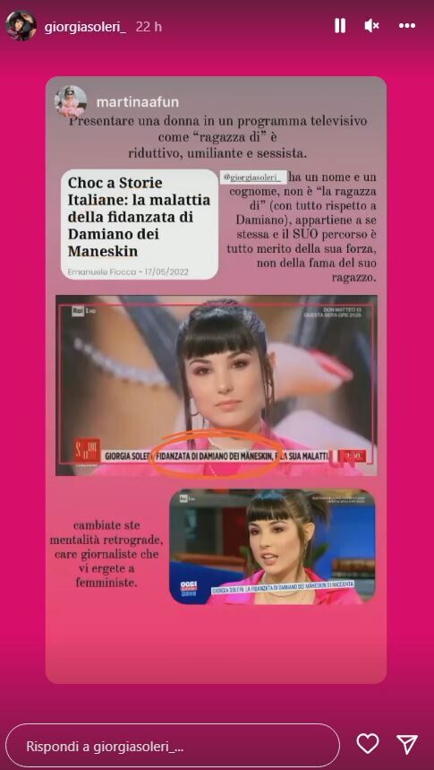 Definita nel sottopancia del video con la dicitura "la fidanzata di Damiano dei Maneskin", Giorgia Soleri si sfoga sui social, appoggiata dai tanti messaggi di protesta dei suoi follower. La giovane attivista, modella e influencer è stata ospite di un programma televisivo in cui ha parlato delle sue battaglie nel nome del women empowerment e per una proposta di legge sulla vulvodinia, patologia di cui soffre, ma anche del suo libro di poesie appena uscito, "La signorina Nessuno". Durante tutta l'intervista però, come hanno sottolineato molti fan della Soleri, l'attenzione è sembrata essere più rivolta al suo ruolo di compagna del frontman dei Maneskin, di cui più volte è stata mostrata l'immagine, che ai temi trattati dall'intervistata stessa.