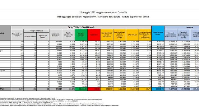 Sono 17.744 i nuovi casi di Covid nelle ultime 24 ore, secondo i dati del ministero della Salute, in calo rispetto ai 23.976 di sabato. Diminuiscono anche i morti, 34 contro i 91 del giorno prima. I tamponi effettuati sono 160.995 (sabato 231.931) e il tasso di positività si attesta quindi all'11%, lo 0,7% in più. Si contano inoltre altri 24.528 tra guariti e dimessi. Scende ancora il numero dei ricoveri.