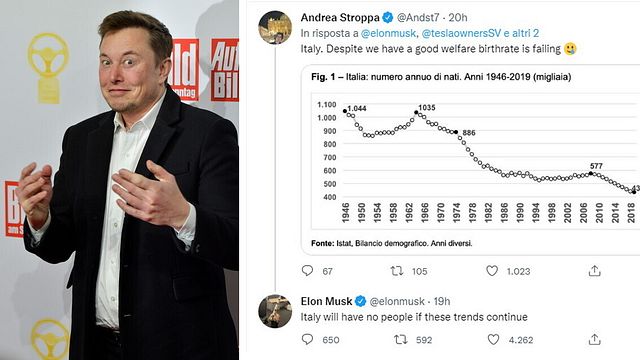 In un successivo cinguettio, commentando un grafico sulla situazione italiana postato dall'analista Andrea Stroppa, il patron di Tesla osserva: "L'Italia non avrà più abitanti se questi trend continueranno".