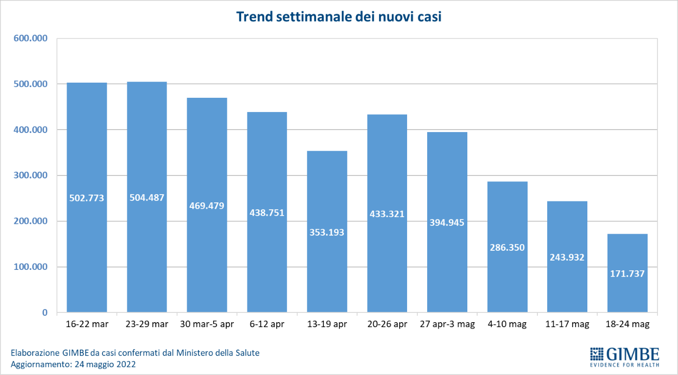 Nell'ultima settimana netto calo di contagi Covid (-29,6%), terapie intensive (-13,9%), ricoveri ordinari (-16,2%) e decessi (-17%). Questi i dati dell'ultimo monitoraggio indipendente della Fondazione Gimbe per il periodo 18-24 maggio. In particolare i nuovi casi settimanali si attestano su 171.737 contro 243.932; flessione dei decessi (633 contro 763). In deciso calo anche i casi attualmente positivi (811.720 contro 967.401), le persone in isolamento domiciliare (805.173 contro 959.599), i ricoveri con sintomi (6.257 contro 7.465) e le terapie intensive (290 contro 337).