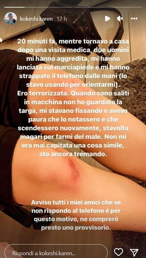 "Venti minuti fa, mentre tornavo a casa dopo una visita medica, due uomini mi hanno aggredita, mi hanno lanciata sul marciapiede e mi hanno strappato il telefono dalle mani (lo stavo usando per orientarmi)", ha scritto Karen nelle storie di Instagram. "Ero terrorizzata", ha aggiunto.