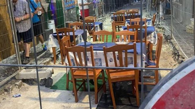 Tre tavolini apparecchiati con cura all'esterno di un ristorante con sedie e tovaglie, pronti ad accogliere i clienti del sabato sera. Nulla di strano se non fosse che ci troviamo all'interno di un'area "cantierizzata" per lavori stradali con tanto di transenne e divieti. Il pavimento è brullo, con un tombino rialzato vista la mancanza dell'asfalto. Circostanza che non ha scoraggiato i titolari dell'esercizio commerciale a occupare l'intero cantiere. La foto che ha immortalato questa scena in via dei Tribunali, lato Sedil Capuano, è assolutamente surreale ed è già diventata virale.