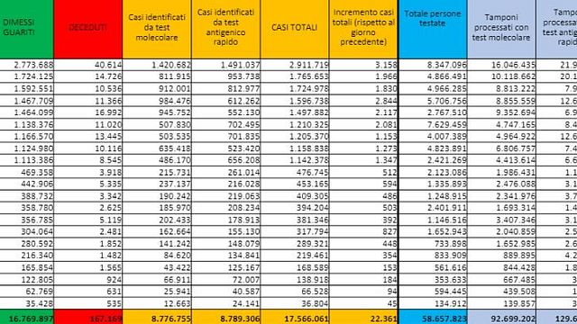 Il numero totale delle vittime in Italia sale a 167.169. Sono 199 i pazienti attualmente ricoverati in terapia intensiva: gli ingressi giornalieri sono 18. I ricoverati nei reparti ordinari sono 4.296.