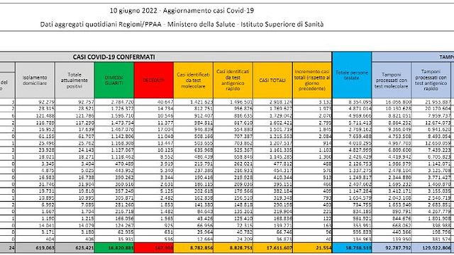 I numeri della pandemia - Sono 623.421 le persone attualmente positive al Covid in Italia, 1.796 in meno nelle ultime 24 ore. Gli italiani contagiati dall'inizio della pandemia sono 17.611.607, mentre i decessi totali salgono a 167.305. Le dosi di vaccino somministrate nel complesso sono 137.934.231.