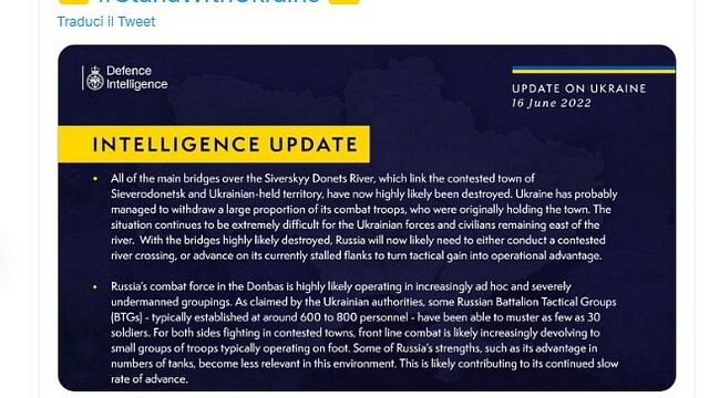 "Le forze di combattimento russe nel Donbass stanno probabilmente operando in raggruppamenti sempre più ad hoc e gravemente sotto organico. Come hanno affermato le autorità ucraine, alcuni gruppi tattici di battaglioni russi - in genere costituiti da circa 600-800 persone - sono stati in grado di radunare solo 30 soldati". Lo scrive su Twitter l'intelligence del Ministero della Difesa britannico nell'aggiornamento quotidiano sulla situazione in Ucraina. "Per entrambe le parti che combattono nelle città contese, è probabile che il combattimento in prima linea si stia riducendo sempre più a piccoli gruppi di truppe che operano a piedi - afferma il report - alcuni dei punti di forza della Russia, come il vantaggio nel numero di carri armati, diventano meno rilevanti in questo ambiente. Questo probabilmente contribuisce alla lentezza della sua avanzata".