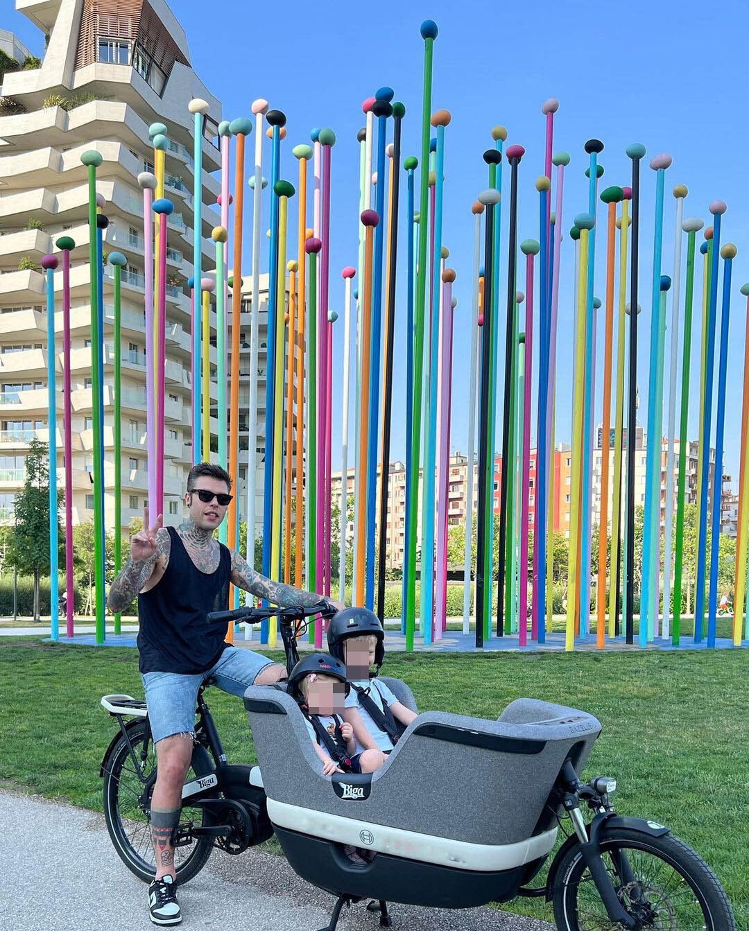 "La vita è fatta di piccoli momenti come questo" ha scritto Fedez postando le foto della passeggita in bici con i figli nel carretto. Canotta nera e jeans strappati il rapper pedala per le strade di Milano, con Leone e Vittoria che si divertono un mondo a bordo della cargo bike insieme a papà.