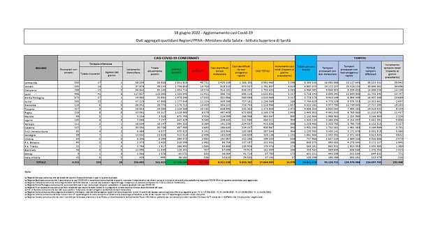 Nelle ultime 24 ore in Italia sono stati registrati 34.978 nuovi casi di coronavirus a fronte di 193.040 tamponi effettuati (mentre il giorno prima l'incremento era stato di 35.427 con 185.819 test). I decessi sono stati 45 (contro i 41 di venerdì) per un totale, da inizio pandemia, che arriva a 167.703. In aumento sia i ricoverati in terapia intensiva (+2), sia quelli nei reparti ordinari (+11). I guariti di oggi sono 45.956. In lieve calo il tasso di positività che si attesta al 18,1% (ieri era stato del 19,1%).