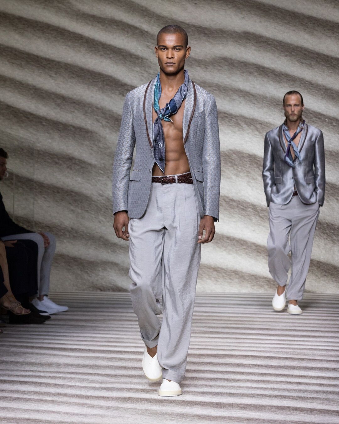 UNO STILE INCONFONDIBILE - Spiccano colori speciali: dal blu al verde, dal viola al sabbia. Il classico blazer si indossa in maniera inedita, come le camicie: con la giacca e la cravatta, ma anche portate fuori. "È vero che un uomo deve essere vestito bene ma deve anche evolvere come evolve il gusto e la moda", ha sottolineato lo stilista. Cappellini senza visiera, niente sneakers ma espadrilles, per “recuperare un modo di muoversi con aria disinvolta a rilassata”.