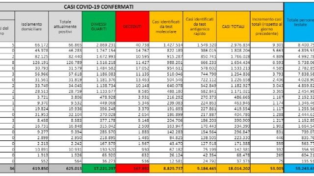 I numeri della pandemia - Gli attualmente positivi sono 625.905, quindi 25.083 in più nelle ultime 24 ore. In totale sono 18.014.202 gli italiani contagiati dall'inizio della pandemia mentre le vittime salgono a 167.892. I dimessi e i guariti sono in tutto 17.221.297.