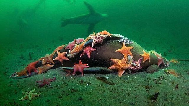 Protagonista dello scatto è una famiglia di stelle marine “pipistrello”, ritratta mentre banchetta felice sulla carcassa di un leone marino. L’animale probabilmente era morto per cause naturali, per lo scontro con un’imbarcazione o anche per aver ingerito della plastica.