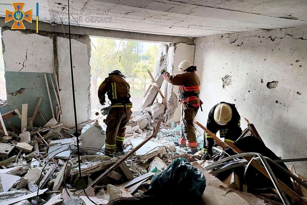 © Afp|Soccorritori tra le macerie dell'edificio distrutto dai missili russi nella regione di Odessa. La foto è del Servizio emergenza Ucraina