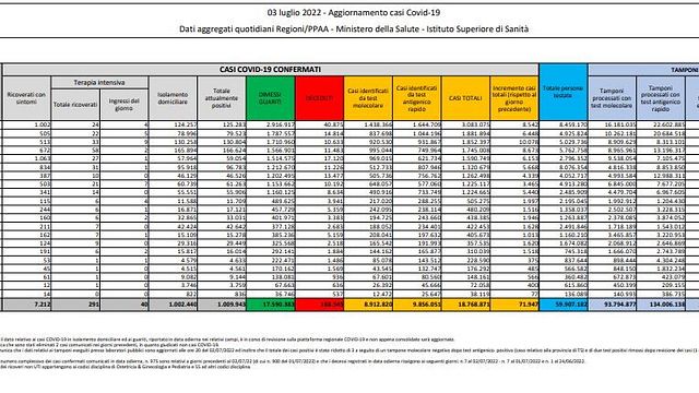 I dati - I ricoverati con sintomi sono 7.212 mentre in isolamento domiciliare, secondo il bollettino quotidiano del ministero della Salute, ci sono 1.002.440 persone. Gli attualmente positivi sono 1.009.943. I casi totali, dall'inizio della pandemia, arrivano a quota 18.768.871.