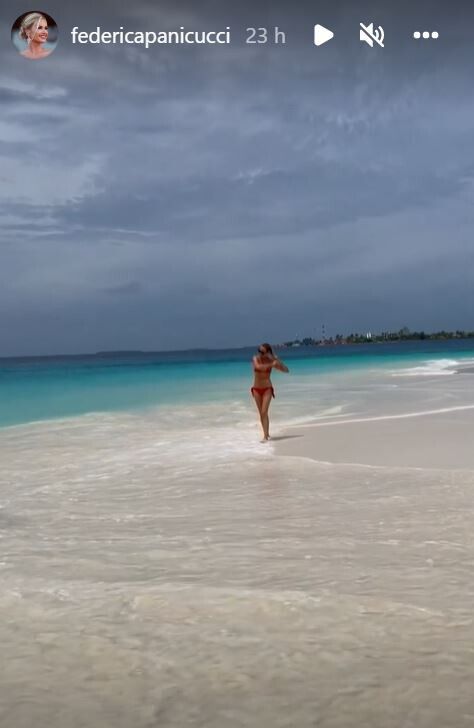 La Panicucci è uno spettacolo. Bikini striminziti e fisico scolpito e perfetto per immagini ad alto tasso erotico dalla sabbia incontaminata del resort in cui la famigliola alloggia. Cammina sul bagnasciuga e si lascia filmare mentre cammina come una modella sulla passerella tra sorrisi e capelli sciolti al vento.