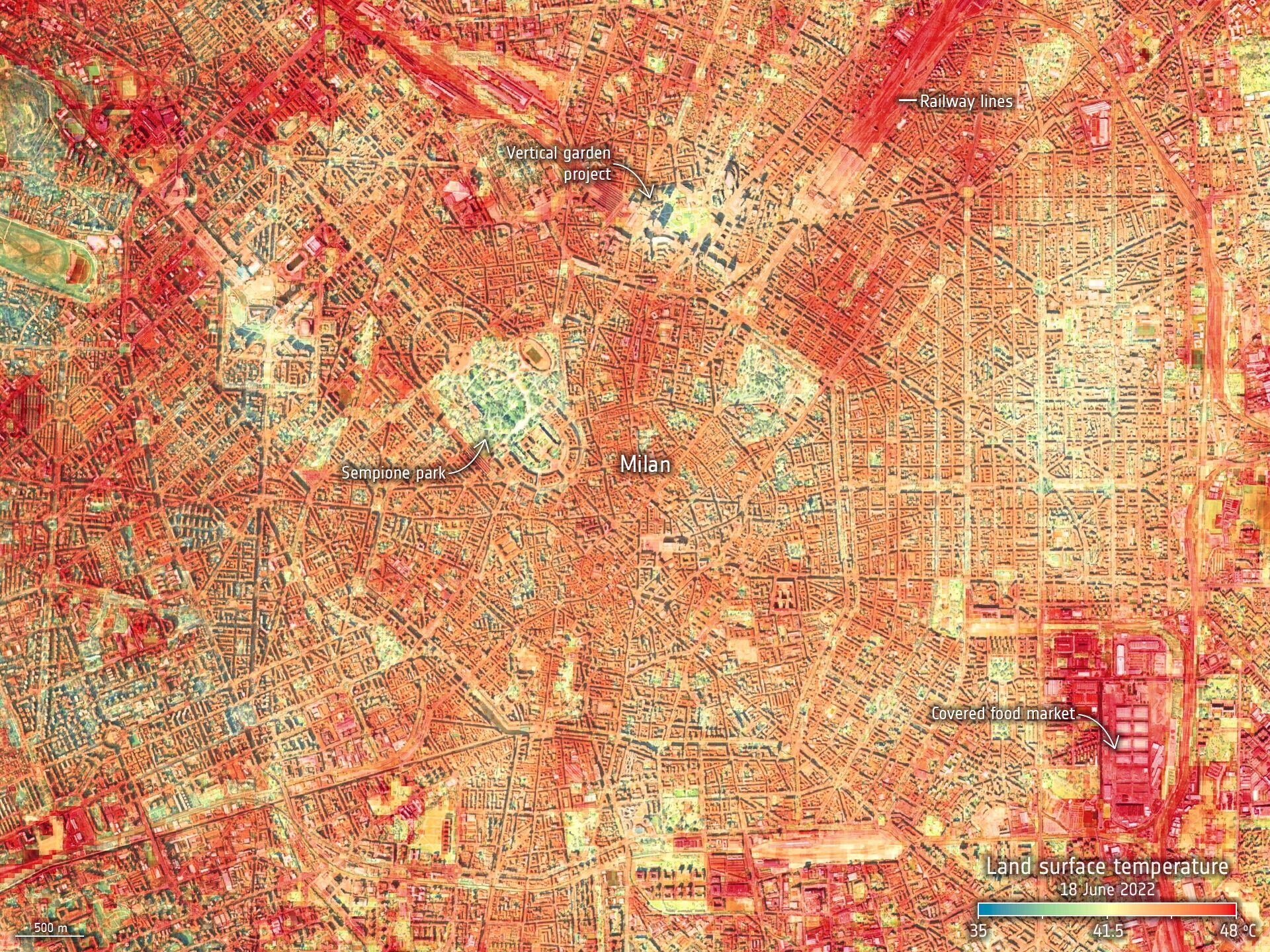Anche dallo spazio si può notare il caldo estremo che si sta registrando in Italia e non solo. L'Agenzia spaziale europea, in collaborazione con la Nasa, è riuscita a "fotografare" la temperatura del suolo di Milano e di altre grandi città. Il risultato è evidente: lo scorso 18 giugno, tutta la superficie del centro storico del capoluogo lombardo era rossa o arancione, colori che segnalano temperature ben oltre i 40 gradi. In corrispondenza di strade e linee ferroviarie, il suolo registra livelli vicini ai 48 gradi. Temperature più basse, ma sempre intorno ai 40 gradi, nelle zone con parchi e aree verdi. Scenari simili anche a Parigi e Praga.