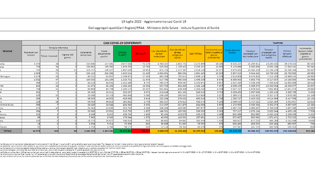 I numeri della pandemia - Sono 1.452.941 le persone attualmente positive al Covid in Italia. Gli italiani contagiati dall'inizio della pandemia sono 20.299.013, mentre i decessi totali salgono a 170.213. Nel complesso sono 138.865.340 le dosi di vaccino somministrate.