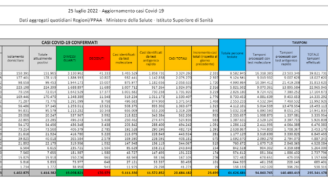 In calo gli attuali positivi - Gli attuali positivi in Italia scendono a 1.414.382, con un calo di 15.483 nelle ultime 24 ore. Il numero totale dei decessi da inizio pandemia è arrivato a 170.979.