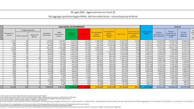 In Italia ci sono 88.221 nuovi casi di coronavirus a fronte di 446.718 tamponi effettuati (mentre il giorno prima l'incremento era stato di 23.699 con 122.550 test). Nelle ultime 24 ore sono stati registrati altri 253 decessi (contro i 104 di lunedì) per un totale, da inizio pandemia, che arriva a 171.232. In terapia intensiva sono ricoverati 434 pazienti (+8) mentre i guariti sono 107.347. Tasso di positività al 19,7% (in leggero aumento rispetto al 19,3% del giorno prima).