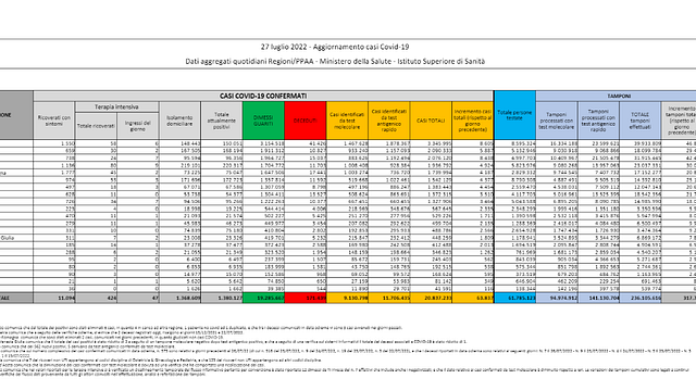 I numeri della pandemia - Sono 424 i pazienti ricoverati in terapia intensiva, mentre gli ingressi giornalieri sono 47. I ricoverati nei reparti ordinari sono invece 11.094, 30 in meno rispetto a martedì. Gli italiani positivi al coronavirus sono attualmente 1.380.127, cioè15.306 in meno rispetto a ieri. In totale sono 20.837.233 i contagiati dall'inizio della pandemia, mentre i morti salgono a 171.439.