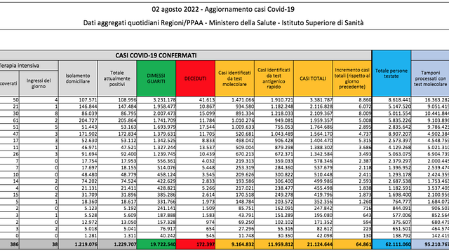 I numeri della pandemia - Sono 1.229.707 le persone attualmente positive al Covid nel nostro Paese. Gli italiani contagiati dall'inizio della pandemia sono 21.124.644, mentre i decessi totali salgono a 172.397. Nel complesso sono 139.670.205 le dosi di vaccino somministrate.