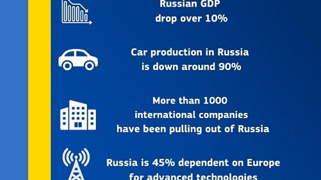 "Diminuzione del Pil russo di oltre il 10%; calo del 90% della produzione automobilistica; più di mille aziende internazionali via dal territorio russo; stop all'export di tecnologie avanzate europee, settore nel quale la dipendenza di Mosca è al 45%". E' questo il primo bilancio delle sanzioni Ue contro Mosca che stila la Commissione europea attraverso un grafico pubblicato su Twitter. A oltre 5 mesi dall'invasione russa dell'Ucraina, - si legge nella nota che accompagna i numeri, - le misure prese da Bruxelles "stanno colpendo duramente e profondamente la Russia".