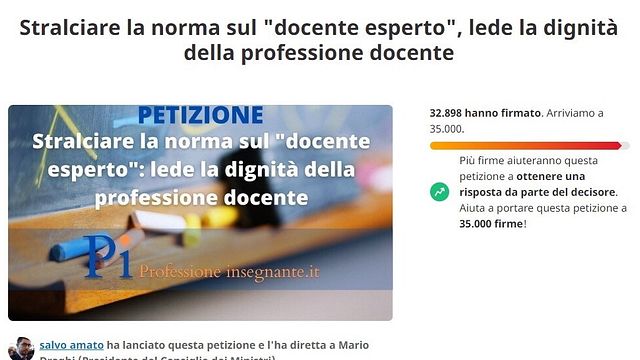 La petizione - "La figura del 'docente esperto' - spiega Amato nel suo appello rivolto direttamente al presidente del Consiglio Mario Draghi per stralciare la norma dalla bozza del decreto Aiuti - è un'idea aberrante per tantissime motivazioni e rappresenta il punto più basso mai raggiunto nella conduzione di un ministero dell'Istruzione, nel tentativo di elargire somme che spetterebbero a tutti come vero aumento di stipendio e che invece verrebbero concesse solo a un docente su 100 mentre gli altri 99 potranno definirsi inesperti. Tutti i docenti meritano un aumento di 400 euro mensili".