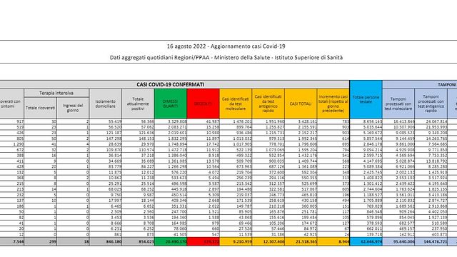 In Italia ci sono 854.023 attualmente positivi. I ricoverati in terapia intensiva sono 299 (con 18 ingressi giornalieri) mentre nei reparti ordinari si contano 7.544 persone. Il totale dei decessi arriva a 174.172.