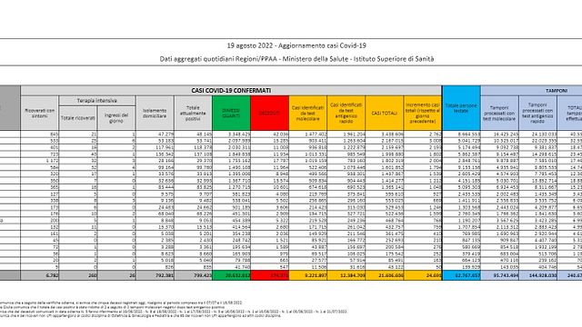 I numeri in ospedale - Nei reparti d'urgenza sono ricoverati 260 malati Covid, negli altri reparti ce ne sono 6.782. Da inizio pandemia sono morte fino ad oggi 174.571 persone e gli attualmente positivi sono 799.423, tra i quali in isolamento domiciliare ci sono 792.381 malati.