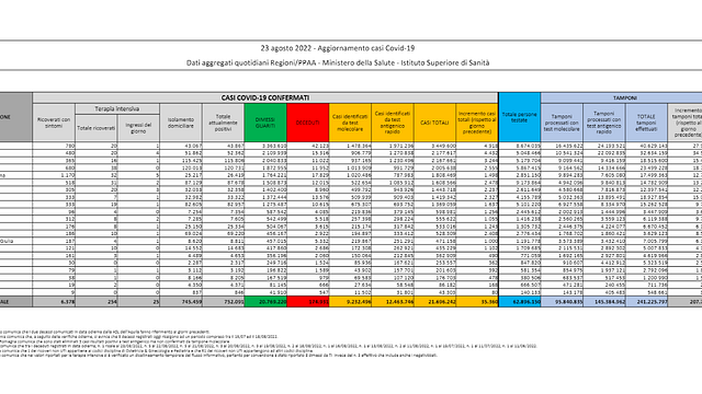 Nelle ultime 24 ore l'Italia registra 35.360 nuovi casi di coronavirus a fronte di 207.761 tamponi (il giorno precedente erano stati 10.418 su 63.188 test). Lo riporta il ministero della Salute, secondo cui i morti sono 134 (lunedì erano stati 75). I dimessi e i guariti sono 50.209. Diminuiscono gli ingressi in terapia intensiva (-1) e i ricoveri nei reparti Covid (-138). In aumento il tasso di positività, al 17,0% (+0,5%).