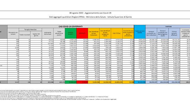 I numeri della pandemia - Gli ingressi giornalieri in terapia intensiva sono 19. I ricoverati nei reparti ordinari sono invece 5.427, nelle ultime ventiquattro ore 204 in meno. Gli attualmente positivi sono 660.241, rispetto a lunedì 8.523 in meno. Il totale dei casi dall'inizio della pandemia è di 21.845.943, quello dei decessi è di 175.505.