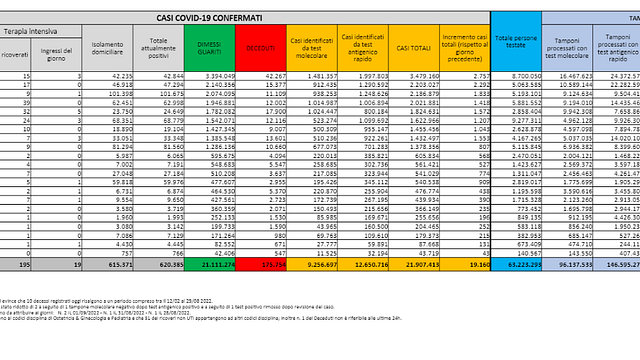 In calo anche i ricoveri nei reparti ordinari (-143). Gli attualmente positivi in Italia sono 620.385.
