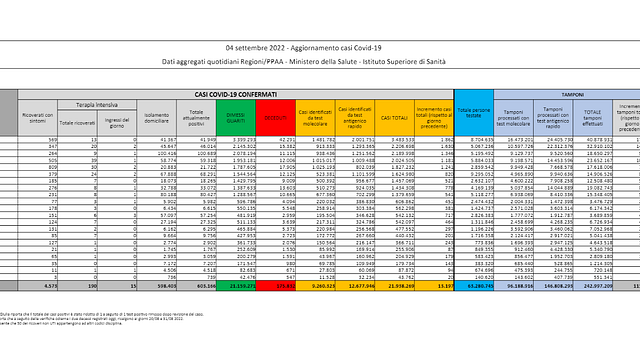 I numeri della pandemia - Sono 190 i pazienti ricoverati in terapia intensiva, 2 in più di sabato, nel bilancio tra entrate e uscite, mentre gli ingressi giornalieri sono 15. I ricoverati nei reparti ordinari sono invece 4.573, nelle ultime ventiquattro ore 57 in meno. Gli attualmente positivi sono 603.166, 5.015 in meno in 24 ore. Il totale dei casi dall'inizio della pandemia è di 21.938.269, quello dei decessi è di 175.832.
