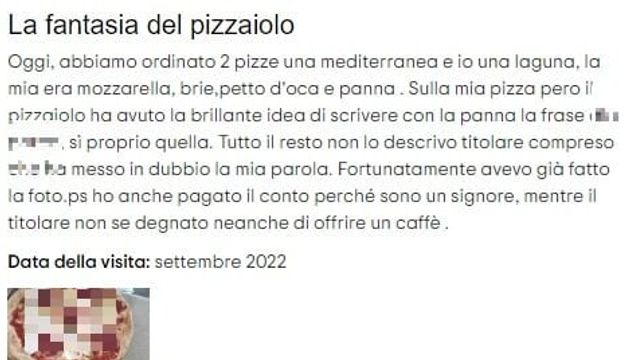 "Abbiamo ordinato due pizze - racconta il cliente - la mia era mozzarella, brie, petto d'oca e panna. Sulla mia pizza però il pizzaiolo ha avuto la brillante idea di scrivere con la panna la bestemmia. Tutto il resto non lo descrivo, titolare compreso che ha messo in dubbio la mia parola. Fortunatamente avevo già fatto la foto. P.s.: ho anche pagato il conto perché sono un signore, mentre il titolare non si è degnato neanche di offrire un caffè".