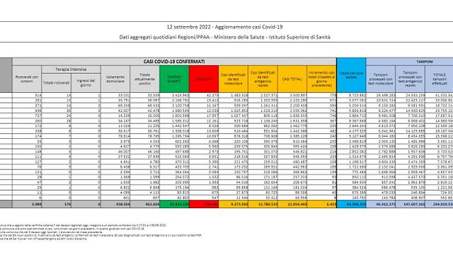 I numeri della pandemia - Il totale dei casi di Covid rilevati dall'inizio della pandemia in Italia è di 22.054.443. Sono 176 i pazienti ricoverati in terapia intensiva, 4 meno di domenica nel bilancio tra entrate e uscite, mentre gli ingressi giornalieri sono 6. I ricoverati nei reparti ordinari sono 3.989, 66 in più rispetto alle 24 ore precedenti. Gli attualmente positivi sono 462.669 (-9.180). Dimessi e guariti sono 21.415.532 (+15.558) mentre il totale dei decessi dall'inizio della pandemia è di 176.242.