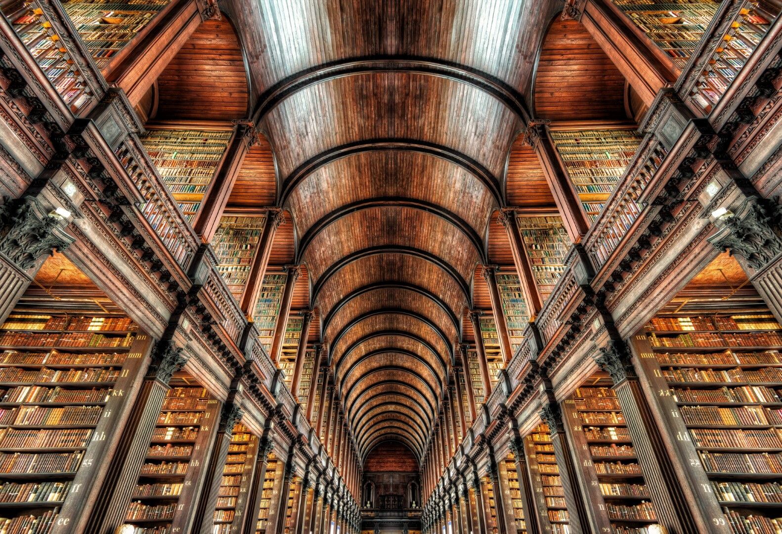 TRINITY COLLEGE LIBRARY, Dublino, Irlanda – Maestosa come una cattedrale, questa biblioteca è un vero pozzo inesauribile di sapere. Raccoglie circa cinque milioni di testi e un'importante collezione di antichi manoscritti: conserva almeno una copia di tutti i volumi pubblicati nel Regno Unito e in Irlanda dal 1801 in poi. È frequentata quotidianamente da studenti e ricercatori, ma anche da turisti, autorizzati ad ammirarla purché il religioso silenzio.