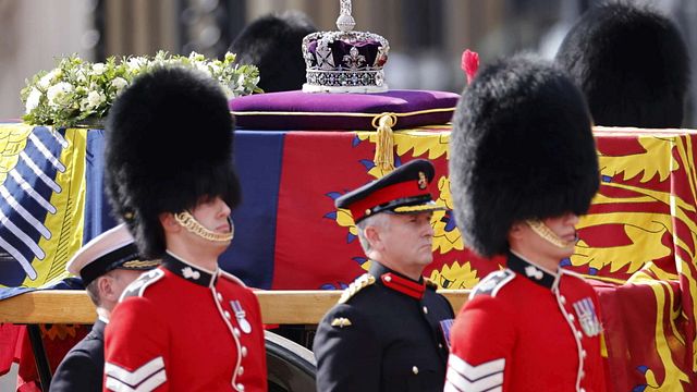 I reali nel corteo funebre - Dietro il catafalco, con una rappresentanza di militari e di alcuni fedeli collaboratori della casa reale, solo il nucleo più intimo della famiglia: in prima fila i quattro figli di Elisabetta (re Carlo III con i principi Anna, Andrea ed Edoardo), in seconda i figli di Carlo (e Diana) con William al fianco del ribelle Harry, quasi a voler accantonare polemiche e pettegolezzi, quindi Peter Phillips (figlio di Anna e nipote più anziano della sovrana), il cugino duca di Gloucester, il conte di Snowdon (figlio della defunta sorella Margaret) e il vice ammiraglio Tim Laurence (consorte di Anna).
