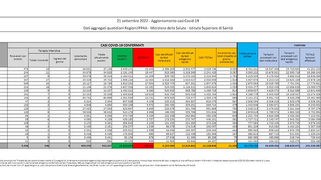 In Italia ci sono 21.190 nuovi casi di coronavirus a fronte di 166.500 tamponi effettuati (mentre il giorno prima l'incremento era stato di 28.395 con 207.434 test). Nelle ultime 24 ore sono stati registrati altri 46 decessi (contro i 60 di martedì) per un totale, da inizio pandemia, che arriva a 176.715. In terapia intensiva sono ricoverati 146 pazienti (-4) mentre i guariti sono 22.102. Tasso di positività al 12,7% (in calo rispetto al 13,7% del giorno prima).