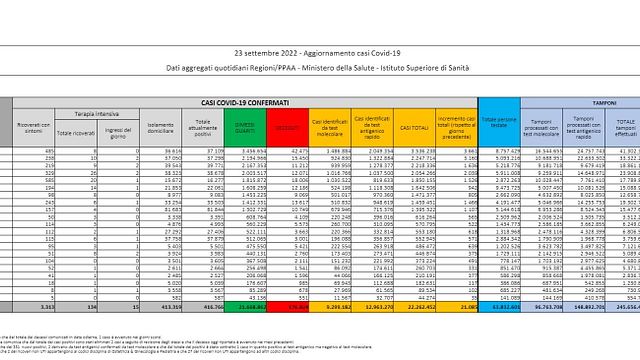 Il totale dei casi di Covid rilevati dall'inizio della pandemia in Italia è di 22.262.452. Sono 134 i pazienti ricoverati in terapia intensiva, mentre gli ingressi giornalieri sono 15. I ricoverati nei reparti ordinari sono invece 3.313. Gli attualmente positivi sono 416.766, rispetto a giovedì 4.031 in più. Dimessi e guariti sono 21.668.862, mentre il totale dei decessi dall'inizio della pandemia è di 176.824.