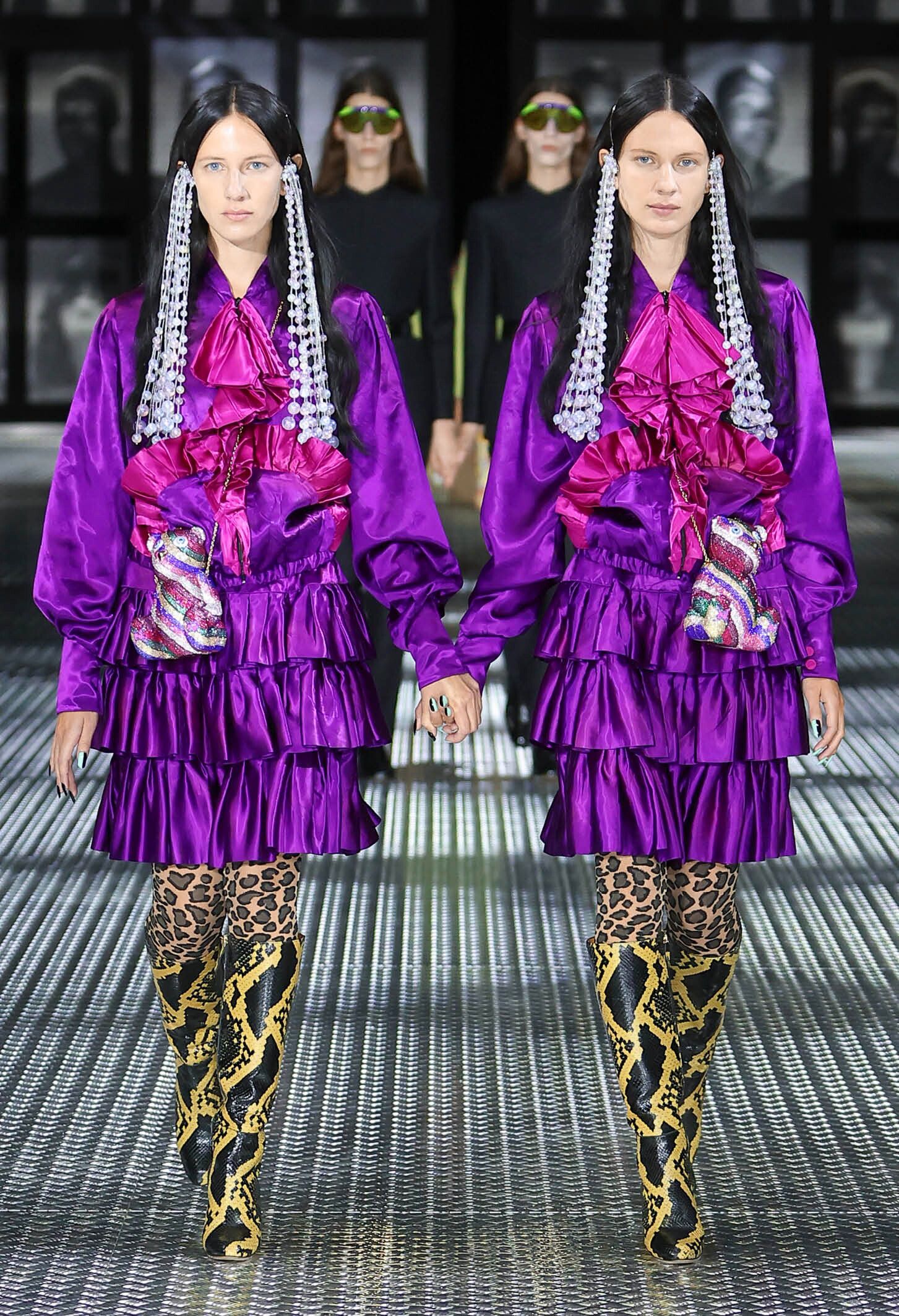 TRA ORIGINALE E COPIA - Nella sfilata i vestiti, come per magia, si duplicano ma per arrivare a realizzare che lo stesso abito sprigiona qualità diverse su corpi apparentemente identici. Completi neri e anni Settanta, pantaloni-giarrettiera e abiti fascianti, tailleur con stampe accese e paillettes. "Sono figlio di due madri: mamma Eralda e mamma Giuliana. Due donne straordinarie che hanno fatto della loro gemellitudine il sigillo ultimo della loro esistenza. Magicamente specchiate. L'una moltiplicava l'altra", ha spiegato lo stesso Alessandro Michele nella lettera con cui ha accompagnato la presentazione della collezione.