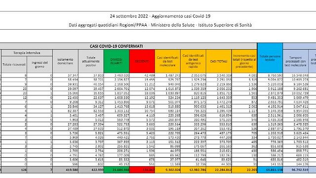 Il totale dei casi di Covid rilevati dall'inizio della pandemia in Italia è di 22.284.812. E' quanto emerge dal bollettino del ministero della Salute. Gli attualmente positivi sono 422.999, rispetto a ieri 6.233 in più. Dimessi e guariti sono 21.684.946 (+16.084) mentre il totale dei decessi dall'inizio della pandemia è di 176.867.
