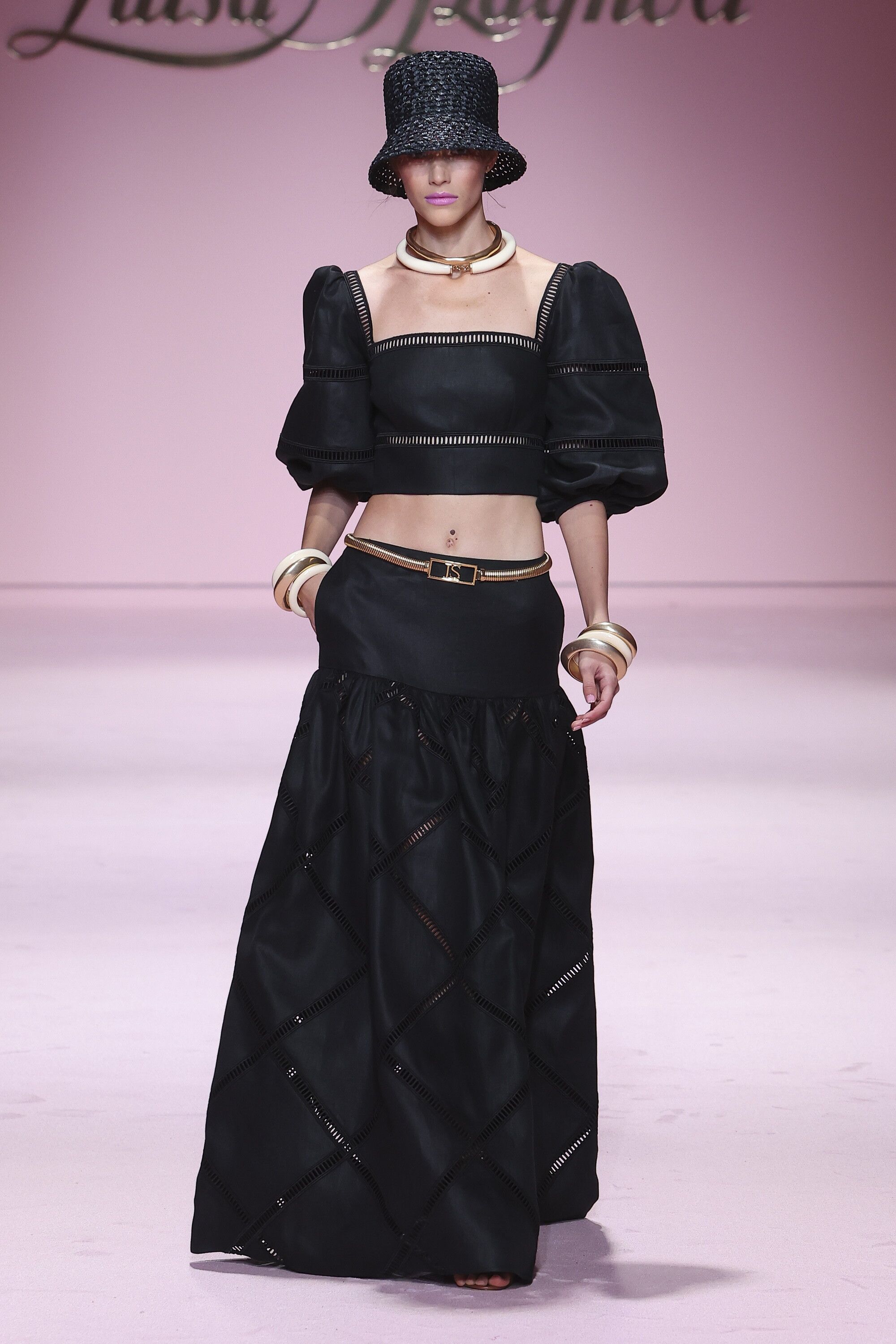 LA COLLEZIONE E I TREND - Per la prossima primavera estate di Luisa Spagnoli, i completi in maglieria con crop top in arancio sgargiante, turchese e fucsia sono accostati a minigonne e scialli coordinati, tutti bordati da frange. Le righe sono maxi, proposte in anticonvenzionali combinazioni di colore su gonne a balze dai volumi generosi, abbinate a sobrie camicie in lino e su abiti dalla linea a trapezio. Sensuali e ammalianti, i body fascianti, indossati a pelle sotto giacche decostruite. Trovano spazio anche i completi pantalone in lino proposti con i gilet, giacche bomber e pantaloncini. Pensati per il tramonto, gli abiti camicia sono impreziositi da cristalli e pietre dure, a incorniciare il decolleté.