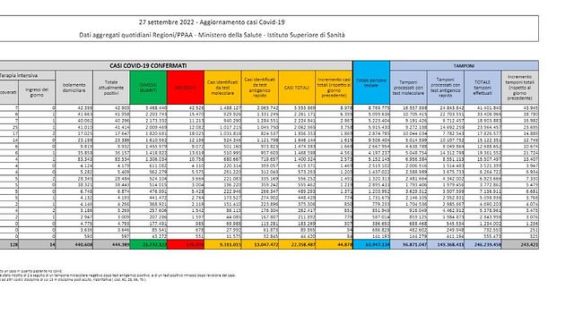 Nelle ultime 24 ore l'Italia registra 44.878 nuovi casi di Covid a fronte di 243.421 tamponi (il giorno precedente erano stati 10.008 su 65.697 test). Lo riporta il ministero della Salute, secondo cui i morti sono 64 (lunedì erano stati 32). I guariti sono 27.854 guariti. Calano gli ingressi in terapia intensiva (-2) ma aumentano i ricoveri nei reparti ordinari (+192). Sale il tasso di positività che si attesta al 18,4% (+3,2% rispetto a lunedì). Non è prevista alcuna proroga per l'obbligo dell'uso delle mascherine su bus, metro e treni, ma anche dentro ospedali, ambulatori medici e Rsa. Il provvedimento scade il 30 settembre.