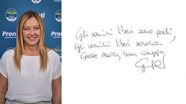 La scrittura della possibile nuova presidente del Consiglio Giorgia Meloni è di media grandezza e scorre sul rigo di base velocemente. È segno di un forte dinamismo, iperattività e velocità di pensiero. Risulta impaziente, immediata nel recepire gli stimoli e nel rispondere alle provocazioni. E questo, a volte, la porta a voler concludere in fretta la questione che sta affrontando, per scaricare prima l'ansia e la tensione che ha accumulato.