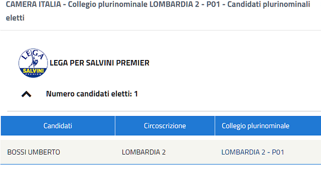 Umberto Bossi, che risultava fuori dal Parlamento nel collegio plurinominale di Lombardia 2 (Varese), rientra ora nell'elenco degli eletti secondo il Viminale. È quanto viene evidenziato dal sito Eligendo del ministero dell'Interno, che ha pubblicato un aggiornamento della ripartizione dei seggi proporzionali della Camera dei deputati in alcuni collegi plurinominali. Ecco chi entra e chi esce dopo le correzioni delle liste.