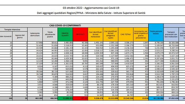 Sono 13.316 i nuovi casi di Covid registrati nelle ultime 24 ore in Italia (contro i 28.509 del giorno precedente), su 85.693 tamponi effettuati. Il tasso di positività si attesta al 15,5% (-3,8% rispetto a domenica). I morti sono 47 (mentre ieri erano stati 20). Aumentano i ricoverati in terapia intensiva (+7) e quelli nei reparti ordinari (+228). I guariti odierni sono 14.269.